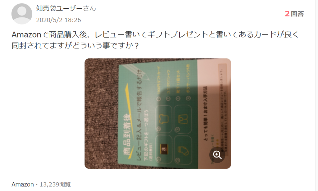 例えば、こんな商品があります。Amazonで購入した製品にレビューを書くとギフト券プレゼントしてくれる物があります。